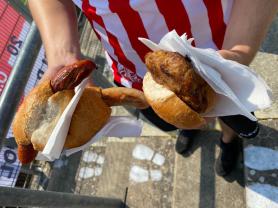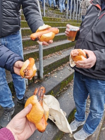 Auswärts in Koblenz - Super Wetter und mit viel Euphorie ging es mal wieder nach Koblenz. Trotz sehr steigenden Inzidenzen in beiden Städten, ging ein kleines Kartenkontigent in der immer noch anhaltenden Pandemie dennoch nach Offenbach. Nach gründlichen 3 G Kontrollen musste man sich erst einmal stärken. Gute Noten gab es für die Auswärts-Bratworscht und Krakauer. Bestens vorbereitet und gut gelaunt für das Spiel wurde man 90 Minuten später wieder eines besseren belehrt. Am Ende reichte es nur zu einem 1-1. Viel zu wenig. Entsprechend frustriert fuhr man dann wieder zurück.