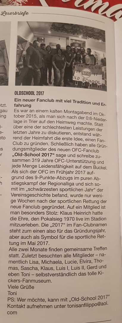 Sage und schreibe 319 jahre OFC-Unterstützung wurden im Frühjahr 2017 in einem Fanclub vereinigt. Nur wenige Wochen nach dem 9 - Punkte Abzung, im pure Abstiegskampf der Regionalliga wurde der Fanclub im vergangenen Jahr gegründet. Besonders stolz war man hierbei auf Klaus Heinrich . Er hatte die Ehre, den Pokalsieg 1970 Live im Stadion mitzuerleben. Die 2017 im Namen des Fanclubs steht sowohl für das Gründungsjahr als auch als Symbol für die sportliche Rettung im Mai letzten Jahres. Die Idee für " Old scholl 2017 " entstand allerdings schon viel früher, nämlich im Oktober 2015. Genauer: an einem kalten und ziemlichen tristen Montagabend. Der OFC hatte gerade mit 0:6 gegen Eintracht Trier verloren. Statt über eine der schlechesten Leistungen der letzten Jahre zu dskutieren, entstand auf der Heimfahrt die ersten Idee für den neuen Fanclub. Mit insgsamt 319 Jahre OFC Unterstützung ,Höhen und Tiefen hatte man gemeisam jede Menge Leidensfähigkeit auf dem buckel. Nun trifft sich der Fanclub alle zwei Monate . Zuletz besuchten alle Mitglieder das tolle Kickers - Fanmuseum . Dazu noch mal ein dankeschön an Kickers Offenbach ,und an unserem Kassenwart Toni der die Idee hatte.