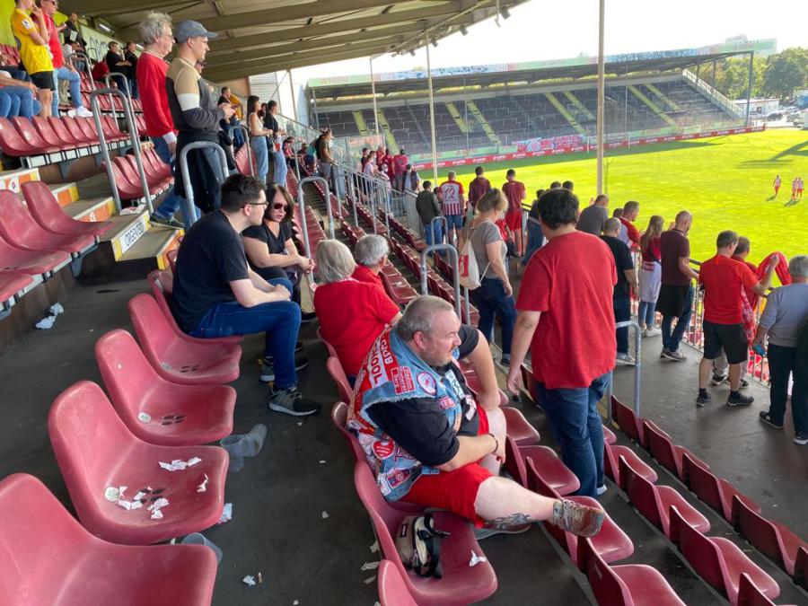Juni /Juli 2021 – Der Ball rollt wieder mit den Fans - Endlich ging es wieder los. Schon am letzten Spieltag der letzten Saison durften wieder einige (mehrere) Zuschauer ins Stadion. Mit einem 1-0 Sieg gegen Mainz wurde die Sommerpause eingeleitet. Eine starke Saison mit 87 Punkten (!) reichte leider nicht zum Aufstieg. Vielleicht fehlten am Ende in der Abrechnung die paar Punkte, die uns durch den fehlenden Support der Zuschauer im Stadion „flöten“ gingen. Scheiss Pandemie, man muss es so deutlich ausdrücken. Neue Saison, neues Glück. Die Sommerpause verging sehr schnell und man freute sich auf die Saisoneröffnung. Diese fand wie schon vor 2 Jahren mit einem Testspiel gegen Rot-Weiss Essen statt, diesmal am heimischen Berg. Gegen starke Essener konnte man nur phasenweise mithalten, am Ende hieß es 1:4. Allerdings war man aber noch mitten in der Vorbereitung.